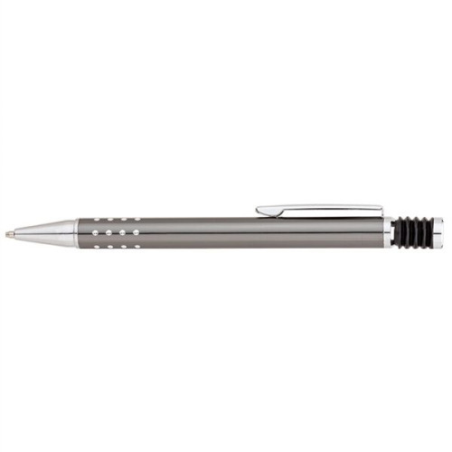 Aluminum ballpoint pen with bellows-style plunger, 24 etched dot grip section and chrome clip and accents.
