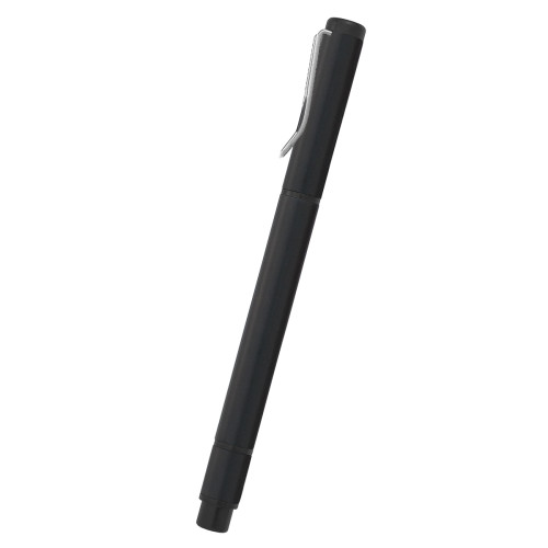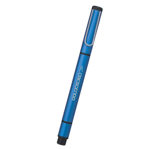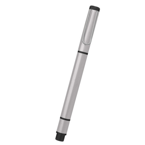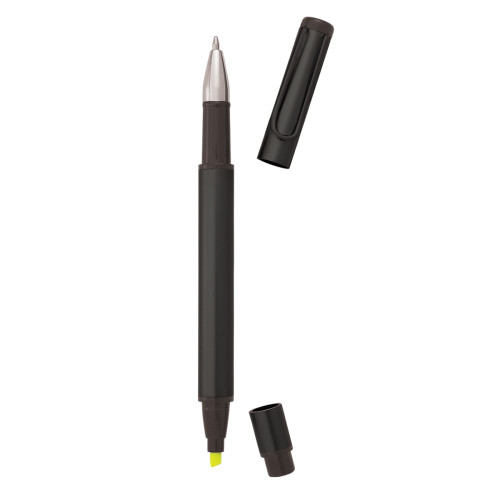 Dual function metal highlighter with chisel tip and ballpoint pen with black ink.