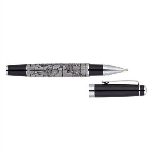 Chrome plated brass rollerball pen with antique world map design on barrel. Cap-off design